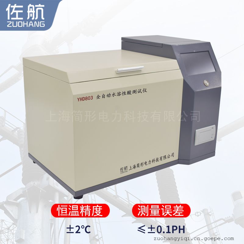 佐航YHD803全自动水溶性酸测试仪(比色法)是根据中华人民共和国国家标准GB/T7598-2008运行中变压器油水溶性酸测试法及相关标准设计制造。采用大屏幕液晶显示,利用微处理器控制,可以根据用户的设定条件自动完成加热、恒温、振荡、取样、测试、清洗、打印等功能,可以一次性测量1-6个样品,大大缩短了用户的测试时间。